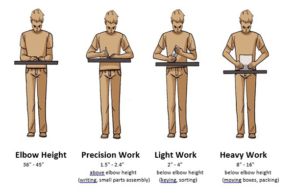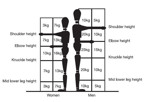 ErgonomieQuoique la législation du Manitoba ne mentionne pas l’ergonomie de façon spécifique, la partie 8 du Règlement sur la sécurité et la santé au travail 217/2006 (Règlement SST) précise les responsabilités de l’employeur pour prévenir les blessures musculosquelettiques (BMS). L’application des principes d’ergonomie permet de prévenir les BMS.L’ergonomie tient compte des capacités physiques, physiologiques, biochimiques et psychologiques d’un être humain dans la conception d’un lieu de travail, d’un équipement, d’un produit, d’un environnement et d’un système global. Il existe trois facteurs qui, combinés, permettent de créer une expérience de travail plus sécuritaire et confortable :Le travailleur – les caractéristiques et capacités humaines, comme l’utilisation d’une technique de levage appropriéeL’environnement – la température, l’éclairage et l’aménagement physique, comme un passage dégagéLes tâches – l’utilisation d’outils, comme le recours à un équipement de levage plutôt que de lever des matériaux manuellementPour découvrir les risques présents dans votre milieu de travail, utilisez la liste de vérification des facteurs de risque ergonomique.Recommandations en matière d’ergonomieHauteurs optimalesCertaines catégories de tâches sont effectuées de façon optimale à des hauteurs spécifiques. La majorité des tâches doivent être réalisées à la hauteur des coudes, à plus ou moins 4 po au-dessus ou en dessous de ce niveau. Les tâches de précision doivent être effectuées à la hauteur de la poitrine ou environ 7 à 10 po au-dessus. Les tâches plus lourdes doivent être accomplies environ à la hauteur des hanches. Gamme de puissanceLa structure de nos articulations, de nos muscles et de notre corps permet à notre corps de mieux composer avec une force supplémentaire, un poids ou des postures dans une partie de la gamme. Le diagramme suivant illustre les principes de la gamme de puissance appliqués au levage en tenant compte de la gamme de levage et de la portée horizontale.Zones de travailLe travail doit être aménagé de sorte à protéger le dos et les épaules; les deux parties les plus susceptibles aux blessures. Le dos est mieux protégé quand les trois courbes vertébrales sont préservées et les épaules sont mieux protégées quand le haut des bras est parallèle à la paroi thoracique de la personne.Dans le diagramme ci-dessous, le dos et les épaules du travailleur sont dans la posture la plus protectrice dans la zone 1. Cette zone est idéale pour les tâches de travail répétitives.Pour un travail dans la zone 2, le dos demeure protégé, mais les épaules sont plus vulnérables. Il faut limiter le travail dans cette posture, tant dans la durée que dans la force exercée sur le corps.La zone 3 place le corps au plus haut risque de blessure au dos et aux épaules. Ici aussi, il faut limiter le travail dans cette posture, tant dans la durée que dans la force exercée sur le corps. Liens connexesListe des sujets en matière de santé et de sécurité